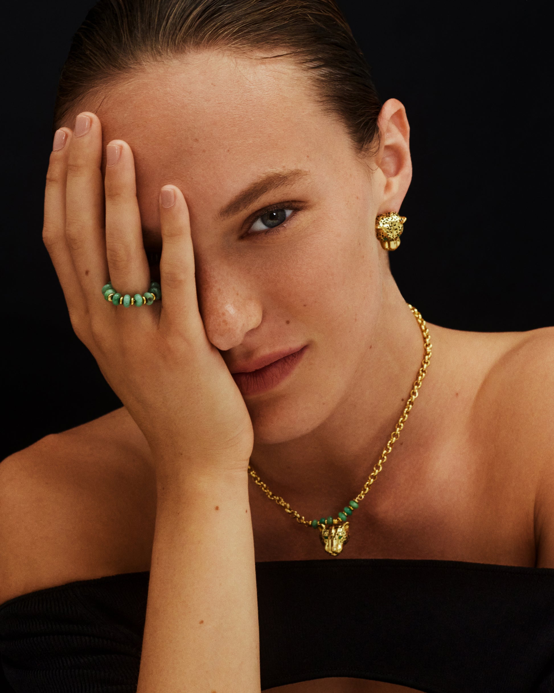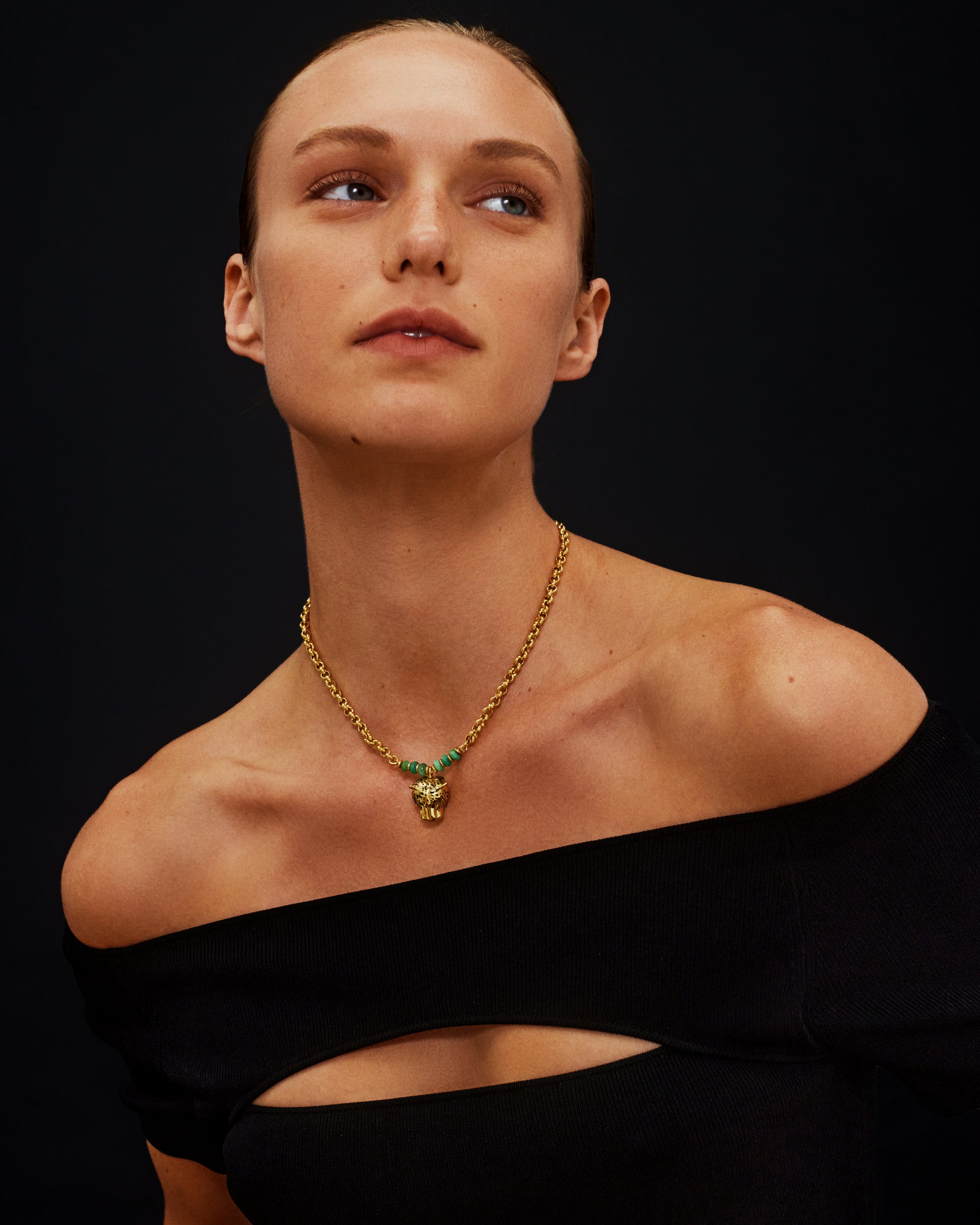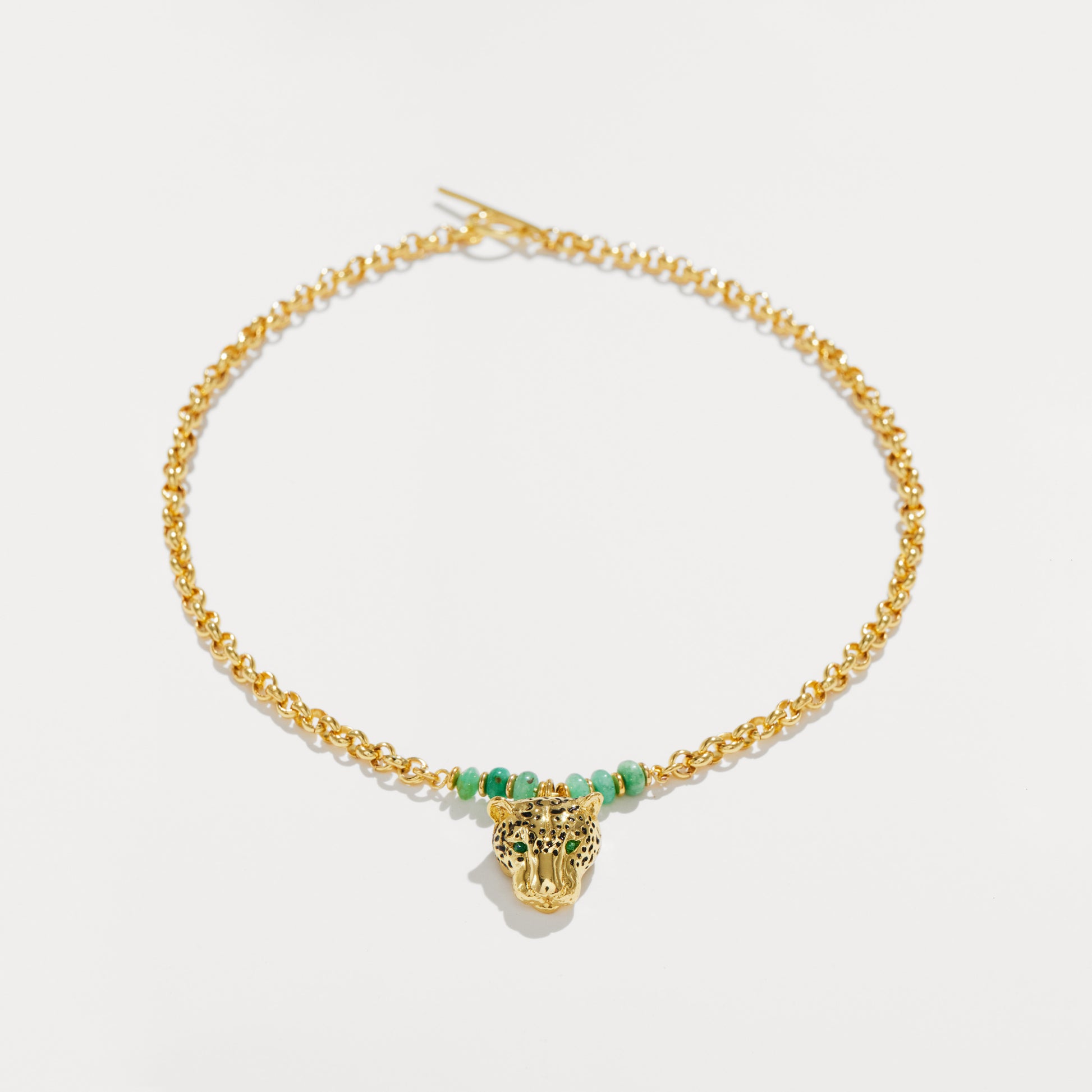 Jaguar Mesai necklace, 24 Karat gold plated over brass featuring 8 Colombian emeralds and black enamel. 17.7” length.